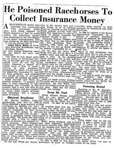 “Leslie White was tried twice for this in 1955-56. In the first trial the jury could not make a decision. After the second trial he was found guilty and sentenced to six years. The deaths of the two horses were five years apart. The first incident did not attract any controversy or any accusations.”
